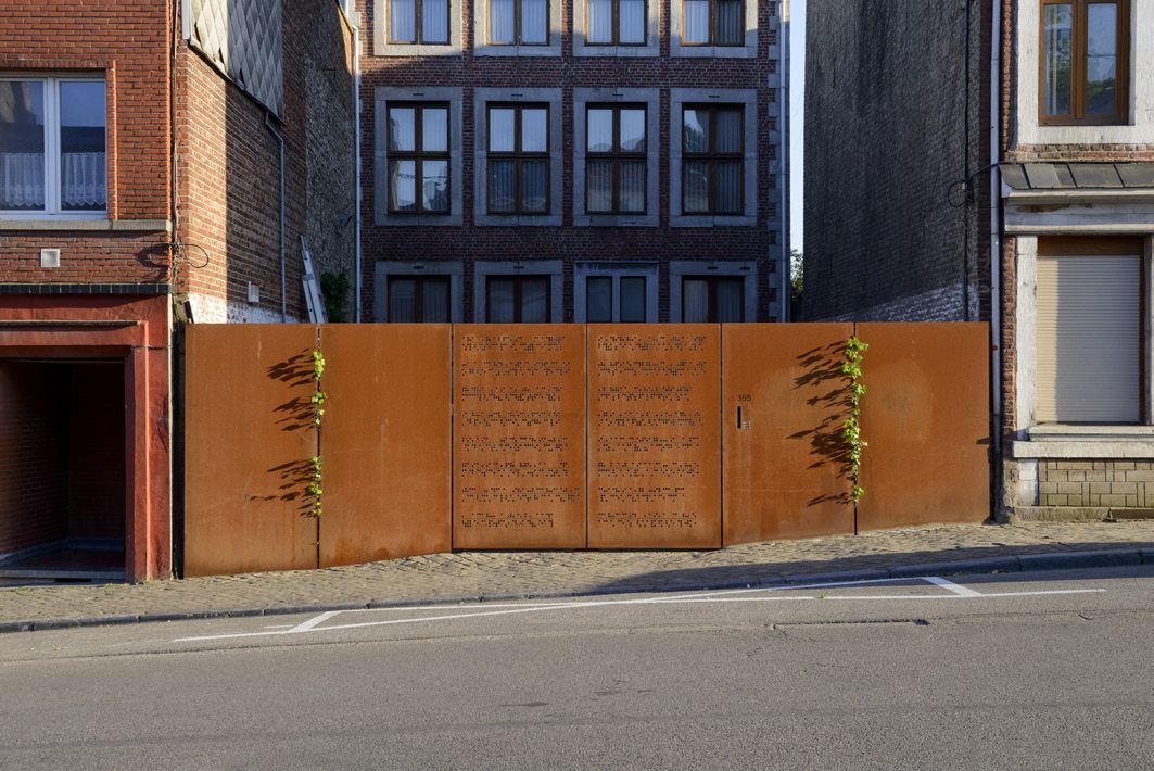 La maison date du début du XVIIIe siècle. Sa rénovation a pris une dizaine d’années. Cerise sur le gâteau, la grille d’entrée a été remplacée par un portail en acier auto-patinable ('corten'). Le maître d’ouvrage souhaitait une tôle perforée comme pour la porte d’entrée mais il voulait que cela ait du sens : les trous dans les ouvrants déroulent les vers du poème ‘L’Albatros’ de Charles Baudelaire en utilisant le code des anciens Télex.