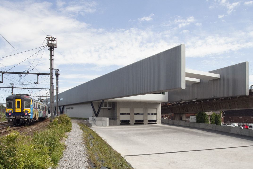 Centre de Distribution Urbaine - dans lequel les marchandises destinées aux commerces de l’intra-ring sont déposées par des véhicules poids lourds pour être ensuite acheminées par des véhicules électriques - a une structure surdimensionnée est capable d’accueillir le programme initial d’un hangar de 2.000 m2 mais aussi d’intégrer des fonctions futures et hypothétiques de parkings (phase 2) et de bureaux (phase 3). Différents types de bardage ont été utilisé : Arval Hacierba 6.175.25.B - HAIRULTRA-HAIRPLUS teinte Titanium d’ArcelorMittal et de panneaux sandwich (Kingspan).