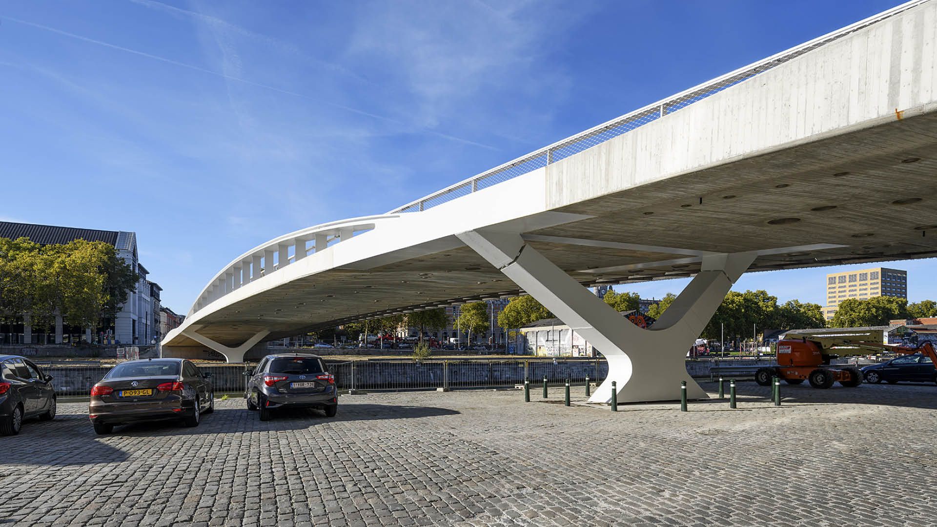 Le résultat se traduit par un pont élancé d'une portée principale de 60 m, construit à partir d'une dalle de béton précontraint de 45 cm d'épaisseur entre les poutres longitudinales, suspendue à des arcs en acier et à des suspentes en forme de plaques. La section piétonne est constituée d'une structure porteuse en porte-à-faux en acier inoxydable de 25 cm d'épaisseur. Dans les deux travées latérales de 27 m de long, les arcs en acier ont été remplacés par des poutres en béton de hauteur variable