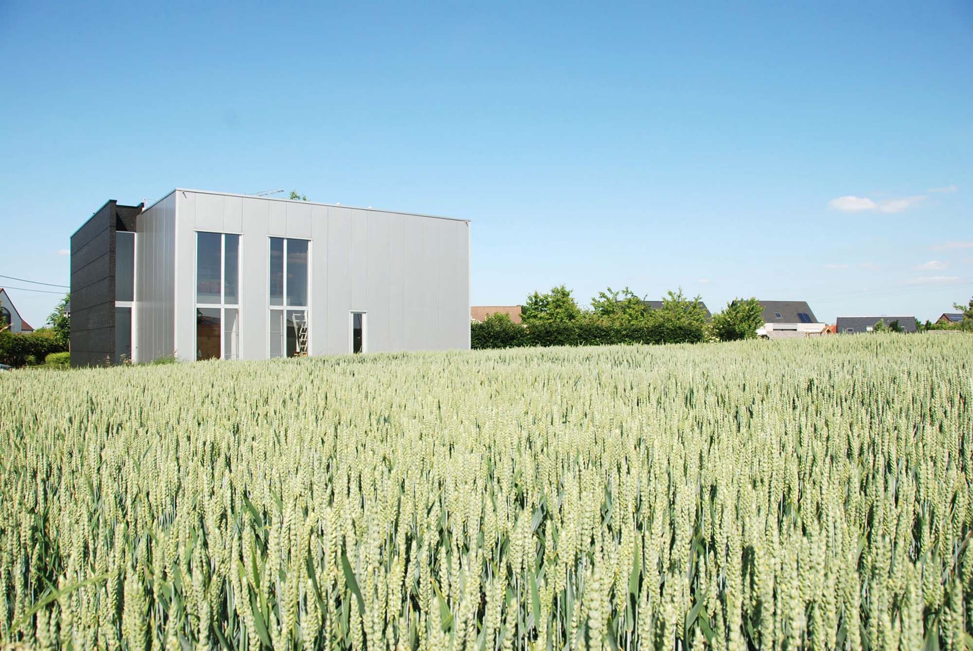 L’habitation est constituée de deux volumes imbriqués. La construction en acier a permis de créer des formes nouvelles et au final une belle oeuvre architecturale. Alors que de la rue l’habitation donne une impression de repli sur soi, l’accent est tout au contraire mis sur le côté jardin. La flexibilité des matériaux utilisés, aluminium et acier, a permis de réaliser de nouvelles formes d’habitat. Malgré l’utilisation de ces nouveaux matériaux, les valeurs architecturales élémentaires restent d’application. Ainsi, l’espace n’est pas déterminé par la surface, mais par une mesure dimensionnelle précise, des vides et les principes du duplex. La passerelle non conventionnelle ne réalise pas seulement la liaison entre les chambres, elle est également un lien avec l’espace de vie. La limite de cet espace est réalisée en acier galvanisé.