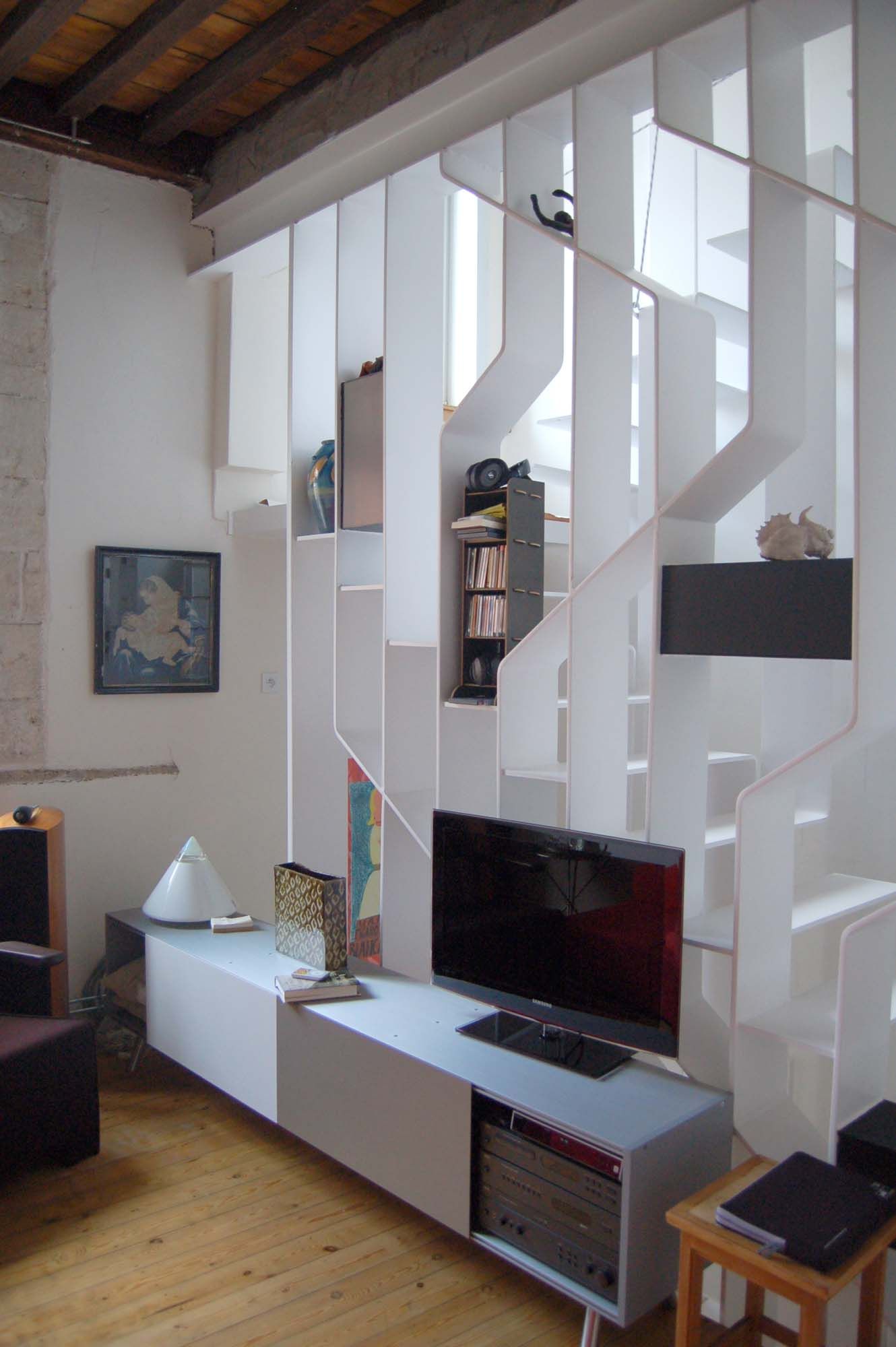 Ainsi, l’ancienne cage d’escalier, très sombre, profite d’une lumière légèrement filtrée qui percole à travers tous les étages, créant un réseau serré dans lequel les objets peuvent trouver leur place. La structure a été entièrement conçue en 3D, et les parties ont toujours communiqué entre elles via 3D numérique.