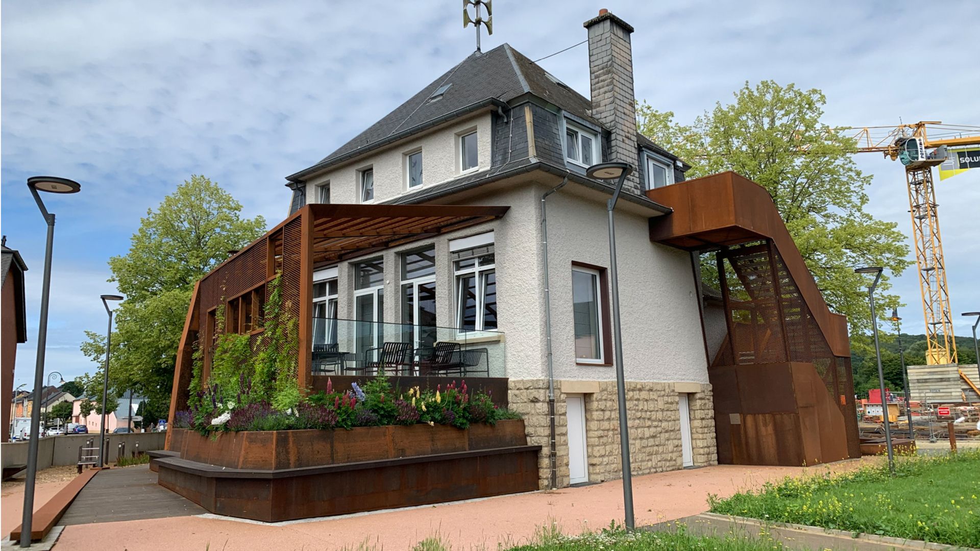 Les flux piétons sont coordonnés par 3 rochers réalisés en acier auto-patinable ('corten') disposés le long de la voirie principale. Ces éléments rappellent la teinte et le travail de la sidérurgie du Minett - une région dans le Sud du Luxembourg et le Nnord de la Lorraine. Le quatrième rocher, la terrasse vient se greffer sur le bâtiment existant, en relation directe avec la pièce de vie commune. Orientée au Sud, elle est également équipée d’une protection solaire fixe en corten déployé qui sera amenée à se faire coloniser au fil des années par une végétation grimpante à partir du sol telle une symbolisation de la nature reprenant ses droits sur l’industrialisation passée.