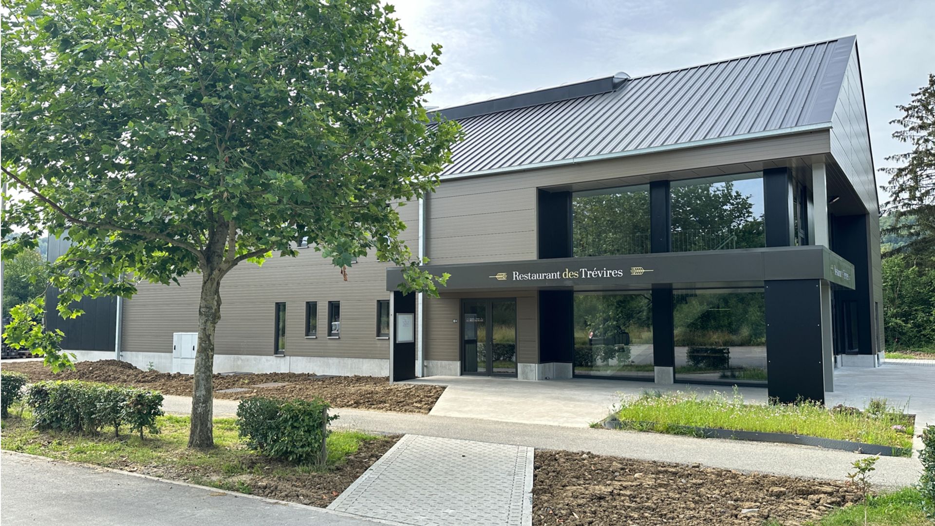 La structure acier s’est imposée pour répondre aux critères d’hygiène et de légèreté structurelle sur un terrain de faible portance. Par esprit pragmatique, le travail d’expression s’est portée sur des volumes en retraits, évidés dans la volumétrie générale. Seul un grand auvent métallique ceinture la partie dégustation et invite les visiteurs dans l’espace tap room. La distinction des 2 fonctions est marquée par la différence de couleur. Dans l’espace Tap room, la baie intérieure cadre sur les cuves en cuivre de la brasserie. À l’intérieur le bar fabriqué en structure métallique de forme ondulée.