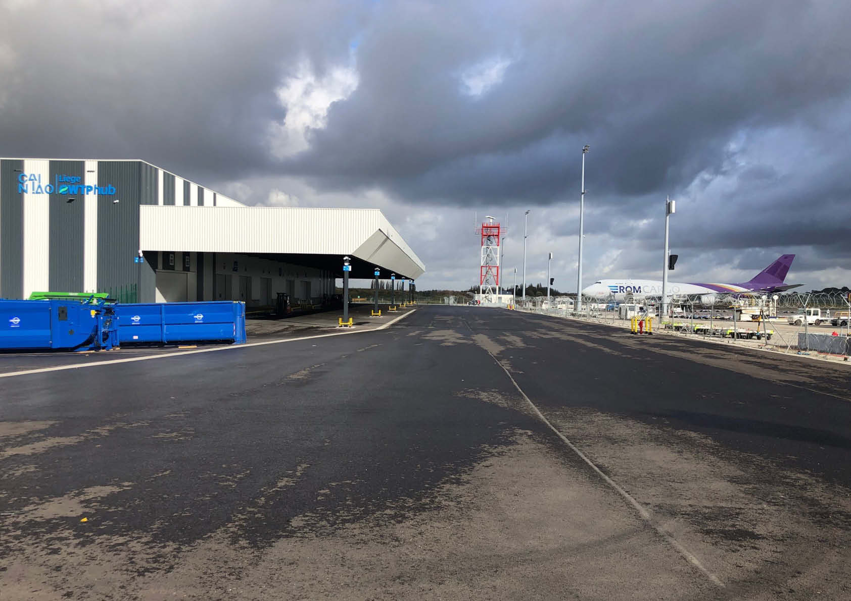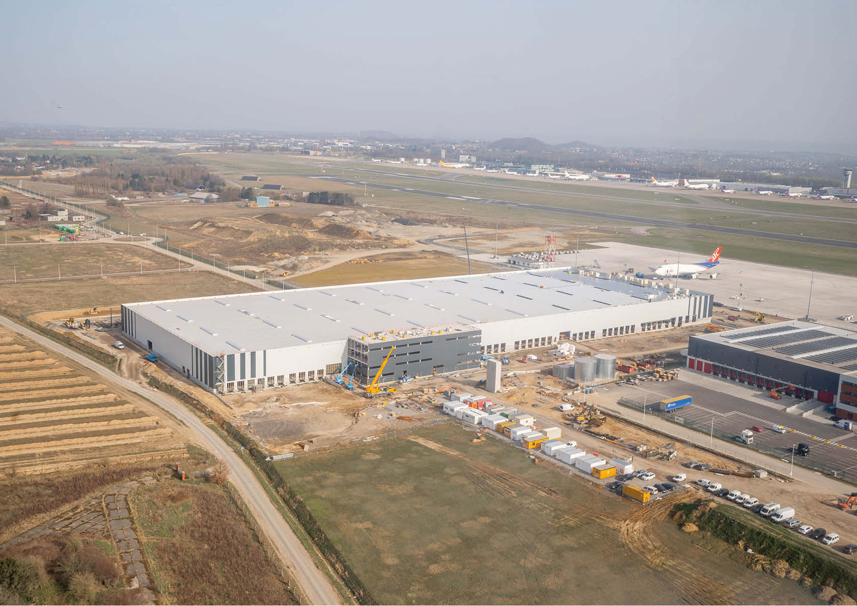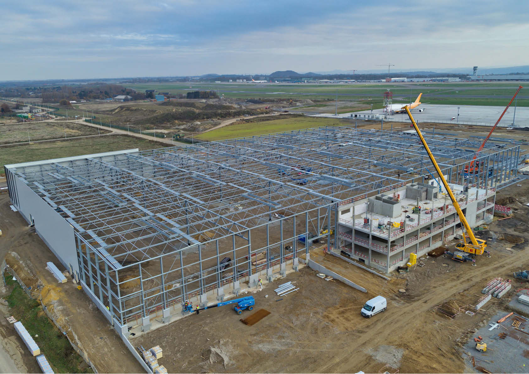 Dit grootschalige project omvat een prefabbetonnen kantoorgebouw van 3200 m² en een enorme logistieke hal van 30.000 m², die is opgetrokken in staal. Deze laatste bestaat uit een regelmatig ras-ter van kolommen. Alle dakbalken, zowel de hoofd- als de secundaire liggers, zijn opgevat als stalen vakwerkliggers, die behandeld zijn met brandwerende REI30-verf.